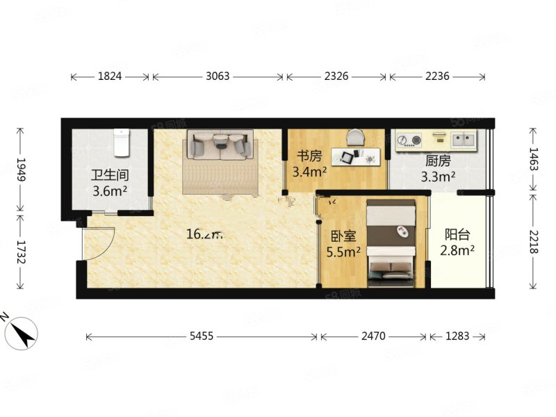 1室1厅1卫      30m²    朝南